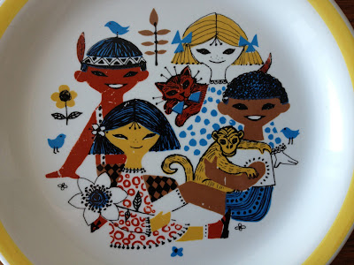 Finally, a real treasure! We got this from my mother in law recently, it's the plate my husband used daily as a child. It's one of those great children's sets from the 60s, and I think this pattern is SO cute. It's "Venner" (Friends) from Stavangerflint, designed by Gro Pedersen Claussen. I haven't been able to find the exact year it was designed, but it must have been some time during the 60s. My childhood sets are still in my parent's house. They're also Stavangerflint from the 60s in a different design, I'll show you some time!